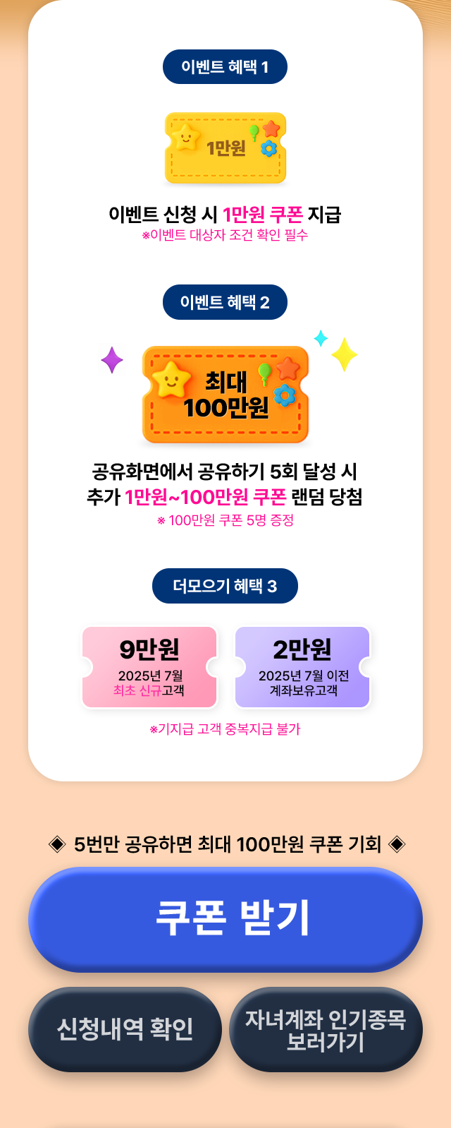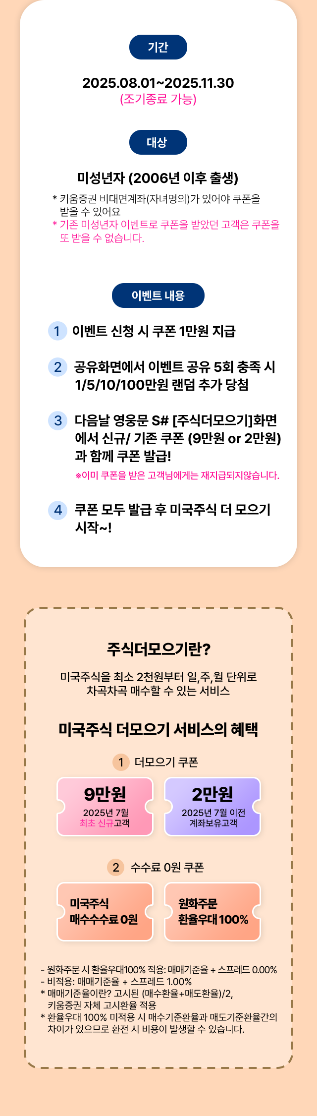 - 이벤트 신청 후 2025년 12월 15일까지 해외주식 거래 가능한 비대면계좌개설을 완료 후 12월 31일까지 영웅문S# [주식더모으기] 화면에서 쿠폰을 발급 하셔야합니다.